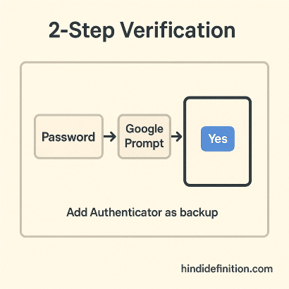 - 2FA (2-Step Verification): पासवर्ड के बाद दूसरा स्टेप (Prompt/Authenticator) —लॉगिन हाईजैक बहुत मुश्किल।