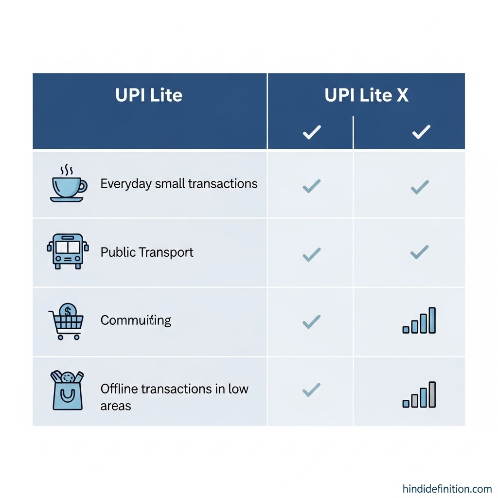 • ऑफ़लाइन/लो-नेटवर्क जगहें (मेट्रो/इवेंट): UPI Lite X बेहतर रहेगा।